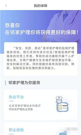 很高兴,通过邻家护理共享平台,我们能够帮助有理想有抱负的护理人员成功建立个人的护理事业。关爱病人、关怀家庭、关心护士、为老龄社会创造价值,是我们的初心,也是我们的诺言。为此,我们将与您携手共筑护理人员护理事业的春天,我们也为所有注册邻家护理共享平台且提供护理服务的全体护理同仁提供全方位的保障!好风凭借力,送我上青天。中国护理服务产业风口已经来临,只要您坚定,我们带您飞!