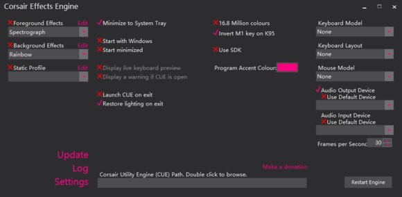 Corsair Effects Engine是一款专门为海盗船键盘设计开发的键盘灯光设置软件。这款海盗船键盘灯光设置软件绿色小巧,运行不占内存,用户可以通过它自定义设置键盘特效,包括灯光效果、闪动频率等,十分酷炫。