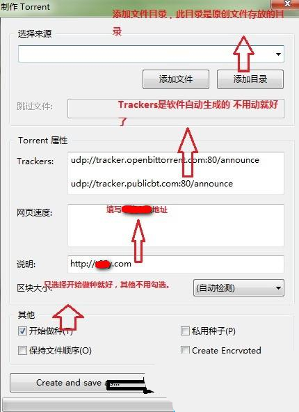 2、之后就会弹出以下窗口,在这里添加文件目录、tracker服务器列表等内容,选择完成后点击创建。等待制作完成在自己设定的保存位置就可看到种子文件了。