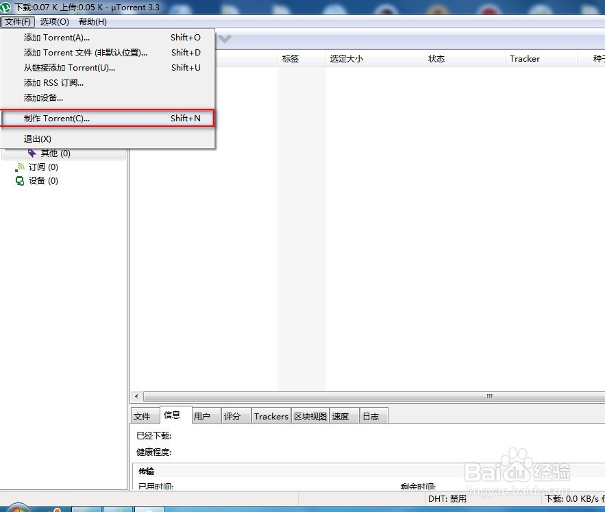 首先,打开utorrent,选择【文件】——【制作种子】,如图: