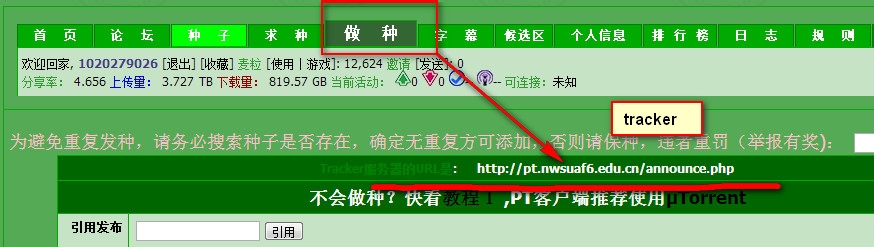 然后再tracker属性填写PT站的tracker,每一个PT站tracker都不一样.现在,本人以MTPT为例。查询tracker可以到站内点击【发布】,有的站是【做种】就可以看到了。如图: