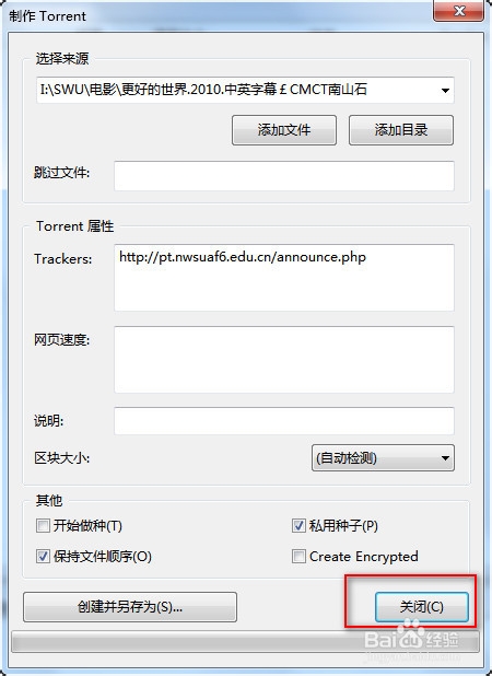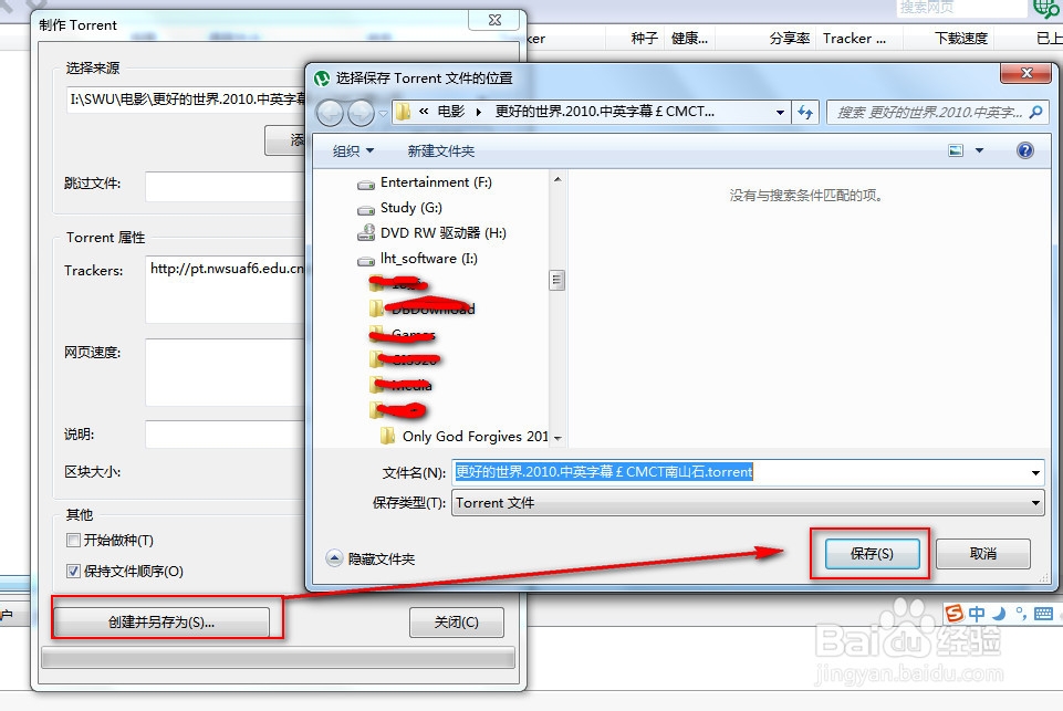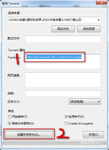 将tracker复制到utorrent的tracker属性内!其他信息不用管,一般默认(具体每个PT站要求可能不一样)。填写好后,【点击创建另存为】,保存种子存放路径。步骤如下图: