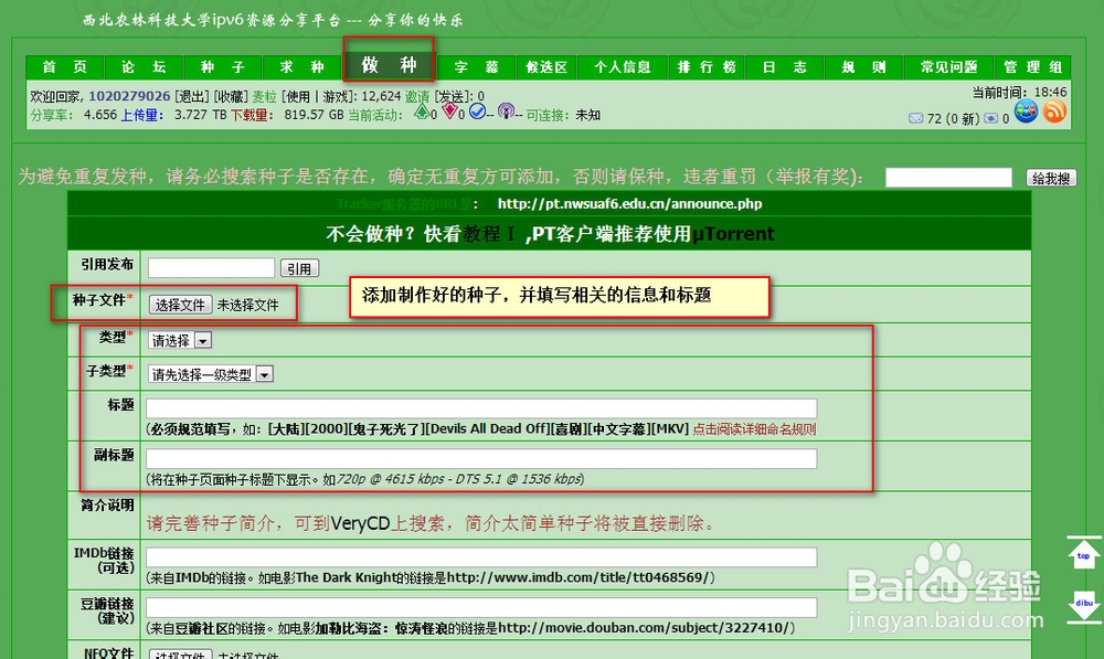 下面,到PT站发布资源,如下图,选择做种,添加种子文件,填写好资源的详细信息并附上图片:填写好后,点击发布即可!