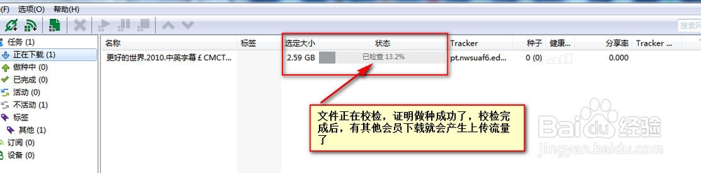 点击确定后,会看到文件正在校检,校检完成后种子资源发布就成功了。只要等待,如果你的资源很火,就会马上有人下载,有人下载就会上传流量了。