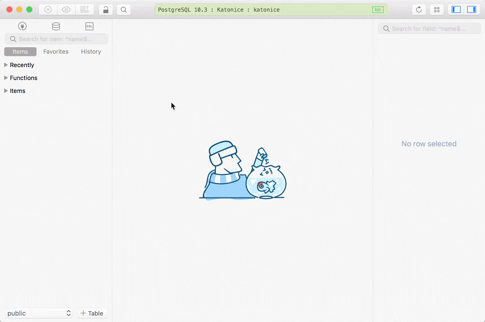 TablePlus 可以搜索数据库里的所有内容,比如各种表,视图,快照和函数. 点击顶部工具栏的放大镜弹出一个类似 Spotlight 的搜索框,你可以输入数据库的任意内容,在搜索的时候软件会自动联想结果,可以使用方向键选择内容,按回车直达目标位置。
