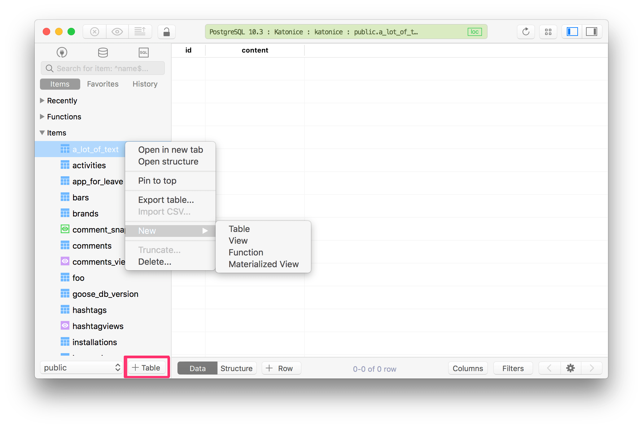 点击下图红框标注的按钮或者在已有的数据表项目上右键,可以选择创建新表,然后使用组合键 ? + S 确认新建操作。