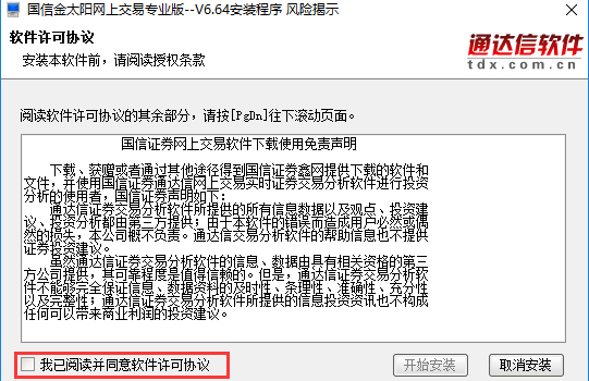 1、在本站下载金太阳国信证券后,在电脑本地得到一个.exe文件,双击.exe文件进入金太阳国信证券软件许可协议界面,您可以先阅读许可协议,阅读完成后勾选“我已阅读并同意软件许可协议”,选择完成后点击【开始安装】。