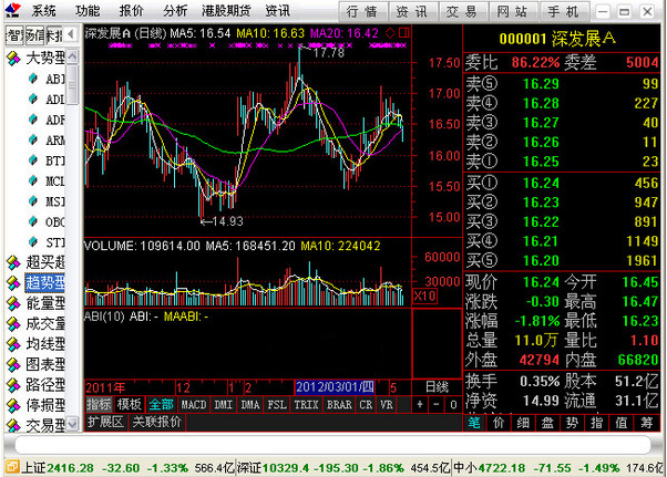 (11) 板块指数:分为行业板块、概念板块、地域板块。显示各板块的名称、涨幅、现价、量比、换手、涨/跌、今开、总量及各板块所包含的个股。