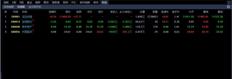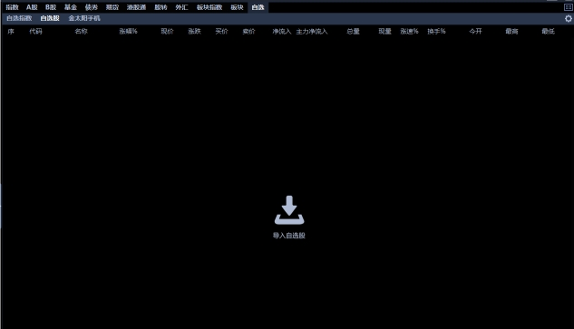 全网行情分为指数、A股、B股、基金、债券、期货、港股通、股转、外汇、板块、板块指数、自选。默认显示“自选-自选股”列表页面。