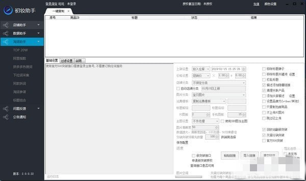 初妆助手是一款功能十分强大的电商服务软件,拥有采集、过滤、突破、极速上下架等于一身的功能优势,还具备数据助手、店铺助手等多种丰富的实用功能,是您打理店铺的贴心小助手。