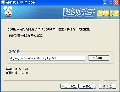 单击【我接受】按钮,打开【安装位置】对话框,单击【浏览】按钮在【目标位置】文本框中设置超级兔子的安装位置,也可采用系统默认安装位置。