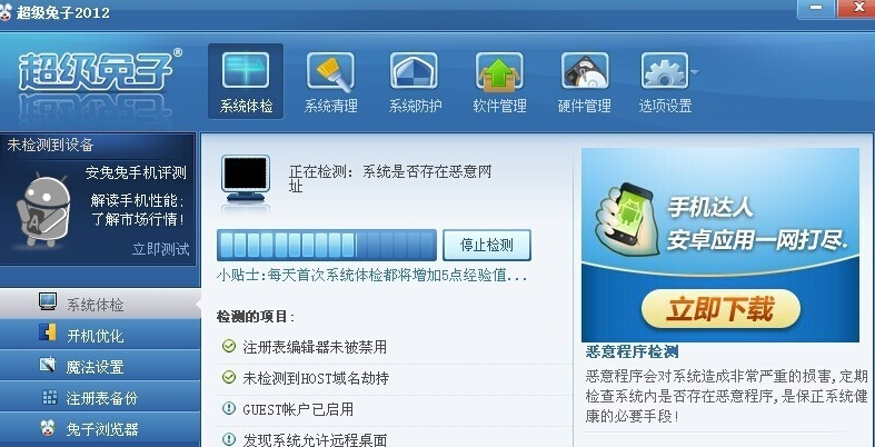 解决方法:软件有自身检查功能,如果发现软件被修改过就会有这样的提示,多数是因为病毒引起的,请清除病毒,然后重新安装超级兔子软件。
