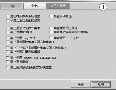 为了避免恶意代码或其他人对系统的恶意更改,可以通过超级兔子的“安全与多用户”进行一些限制。如图1所示,我们可以勾选一些选项对系统加以保护,如“禁止使用Format.com、Deltree.exe”、“禁止使用注册表编辑器”、“禁止更改.reg文件”等。