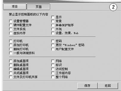 为了避免其他人恶意更改控制面板的选项属性,可通过在“兔子”中的“控制面板”的“页面”选项对一些内容进行禁止操作。这样其他人就不能更改其中的项目了。如图2所示。