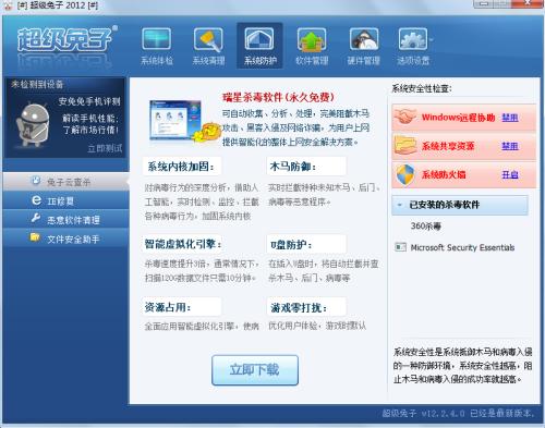 超级兔子是一款拥有超过10年历史的老牌计算机功能辅助软件,它能帮助用户轻松辨别硬件真伪、安装硬件驱动、维护系统安全、安装系统补丁及软件升级、优化清理系统、清除系统垃圾、提升电脑速度、保护IE安全、监测危险程序、屏蔽广告弹窗、清理流氓软件……真正让用户打造属于自己的安全系统。超级兔子系统检测可以诊断一台电脑系统的CPU、显卡、硬盘的速度,由此检测电脑的稳定性及速度,还有磁盘修复及键盘检测功能。超级兔子进程管理器具有网络、进程、窗口查看方式,同时超级兔子网站提供大多数进程的详细信息,是国内最大的进程库。