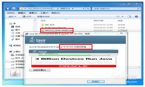 关闭电脑杀毒软件,以管理员权限完成JAVA虚拟机的安装,并关闭安装完成向导,如图示界面。