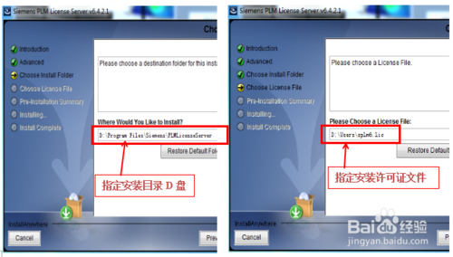 根据许可证安装向导,单击下一步,设置好安装目录D盘,指定前面替换电脑名称的“splm6.lic”文件,单击下一步,完成安装,并退出许可证安装向导,如图示界面。