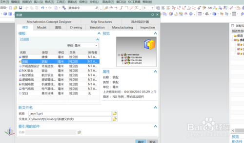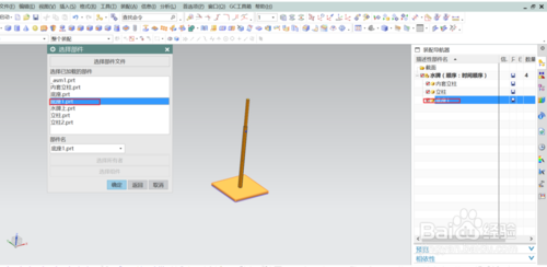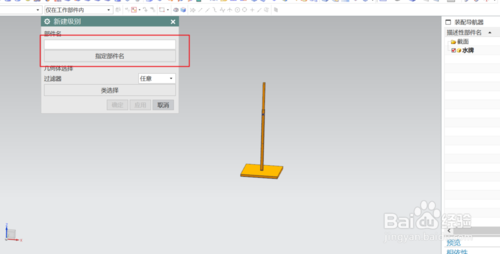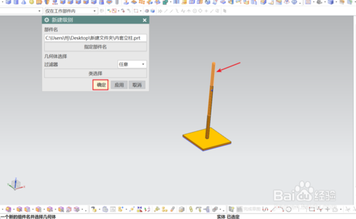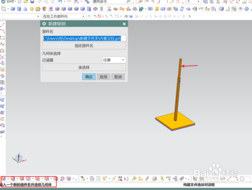 在弹出的对话框中点选“指定部件名”,会弹出新建部件对话框,根据提示在原模型的文件夹中建一新文件名点确定,跳回到新建部件对话框后,从模型中选择要成为该部件的几何体,点确定;这时在装配导航器的模型下会产生一个新的组件。