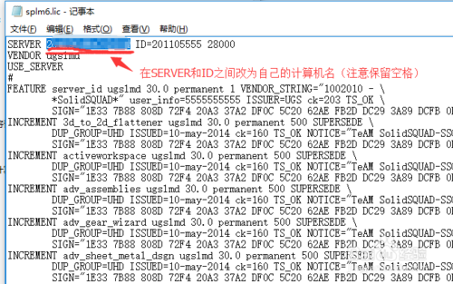 打开许可文件后,将第一行部分内容按下图改为自己的计算机名。