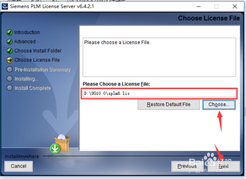 单击”Choose",选择前面修改过的许可文件”splm6.lic"。