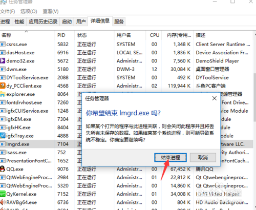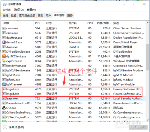 打开“任务管理器”,在“详细信息列”找到两个“lmgrd.exe"文件将其结束。如何关闭“任务管理器”。