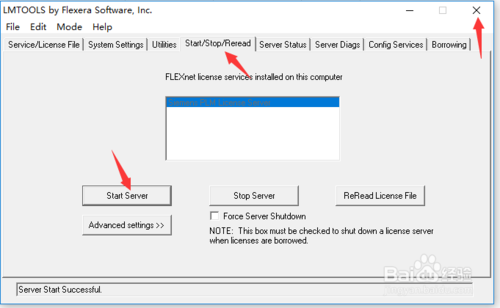 单击”Start/Stop/Reresd"项,单击“Stsrt Server",在左下角提示启动成功。单击”关闭“按钮关闭。