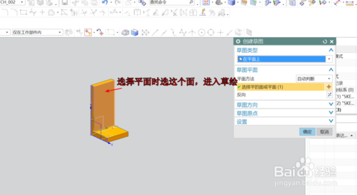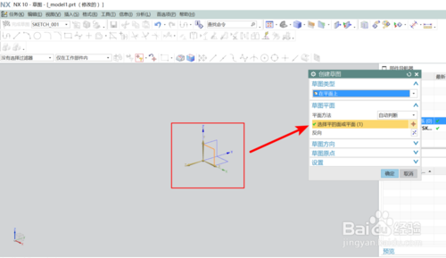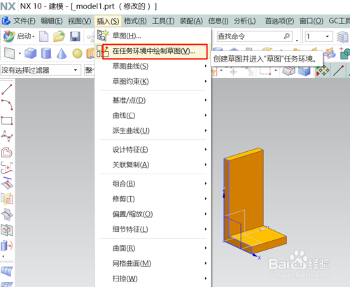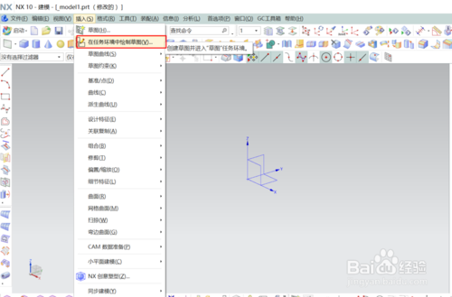 选菜单栏如图选“在任务环境中绘制草图”。要进行拉伸得有截面线,现在的草绘就是绘制截面。选择XZ面为草绘面,点确定进入草绘页面。