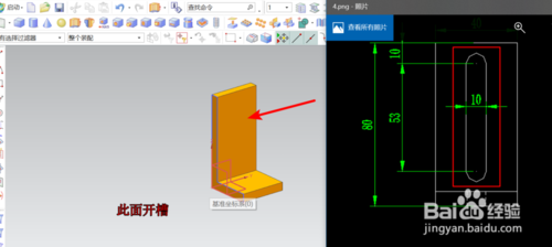 如图,要在该面开一槽;只要按开槽的尺寸拉伸出一实体与主体进行布尔差运算就可得到这槽了。首先,在要开槽的面上进行拉伸的截面线绘制。如图。