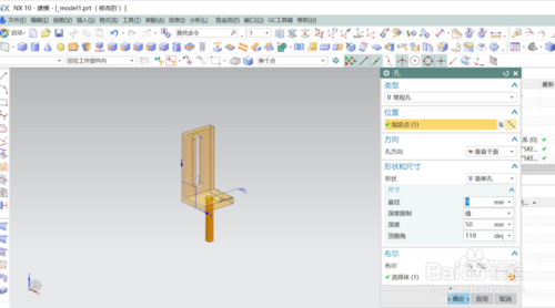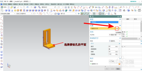 该模型还有一个孔要钻,在要钻孔的面上建立草绘平面;只要定位好一点就行了。完成点的定位后退出草绘,选好孔的参数确定即得所要的孔。
