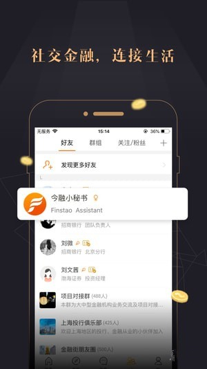 今融道APP用户已涵盖各大金融机构、上市公司及大中型企业投融资人员,无论你是行业资深大咖,还是初出茅庐的金融小生,在这里都可以找到自己的圈子。
