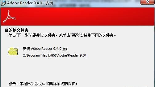 2、选择软件目的地文件夹,默认“C:\Program Files (x86)\Adobe\Reader 9.0\”,如需修改点“更改目标文件夹”