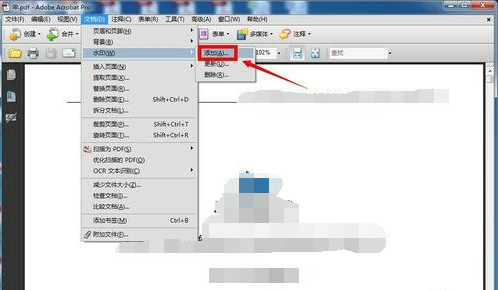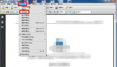 用Adobe Acrobat 9 Pro 打开你要添加水印的文件,点击上方菜单的文档--水印,如下图所示