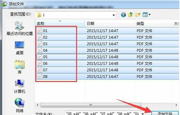 找到要合并的 一批PDF文件,全选后,点击 添加文件.