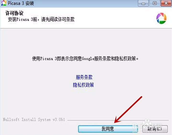 安装首先从本站点击下载好的Picasa的软件安装包,打开主界面,点击下面的“同意”