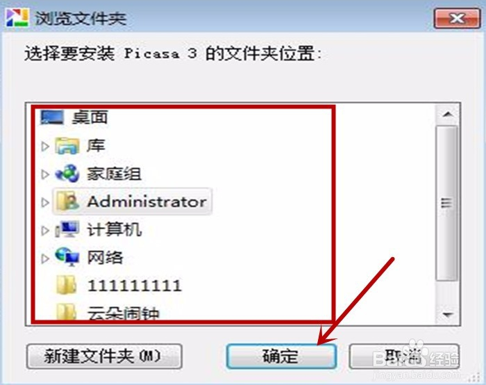 在弹出的文件夹对话框,选择好磁盘,新建或使用已有的文件夹,点击“确定”