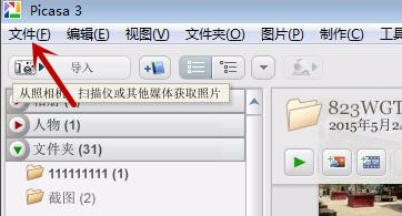 之后我们用鼠标左键点击Picasa主界面工具栏中的“文件”按钮。或者可以按键盘上的Alt+F快捷按键,打开文件选项卡。