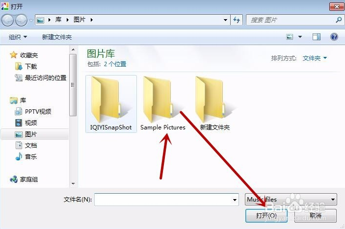 找到一个存放音乐的文件夹,选择需要的幻灯片或影片的音乐,点击打开,即可添加成功,如图所示