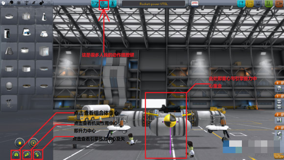 垂直起降,首先,飞行器需要垂直起飞,那么我们必须将起飞引擎的推力中心和飞行器的重心竖直方向对齐或重合,即游戏中黄球和红球见下图
