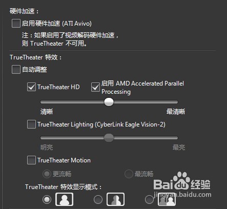 4.看到TrueTheater特效这一栏,勾选TrueTheaterHD,下面的清晰度自己调整。如果是AMD的cpu还可以勾选AMD Accelerated Parallel Processing这一项