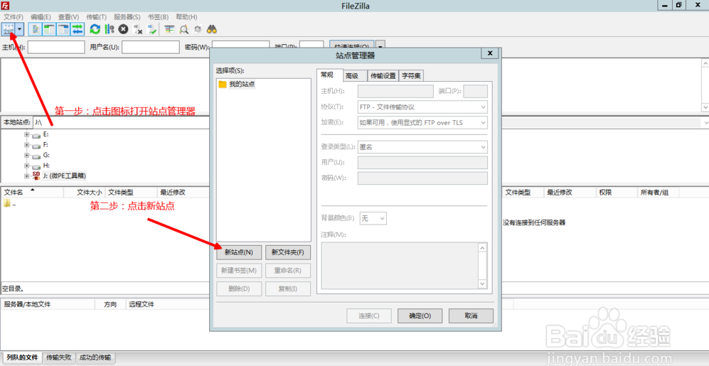 设置软件:首先,按照下图的提示,打开站点管理器;然后,点击新站点;