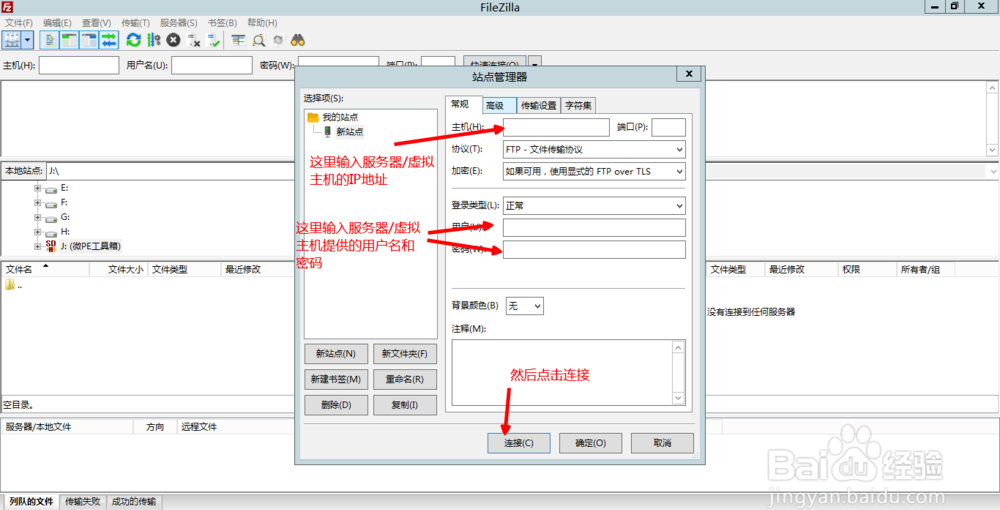 在新站点内输入服务器/虚拟主机提供的IP地址、用户名和密码,然后点击“连接”按钮,即可登录到服务器/虚拟主机。