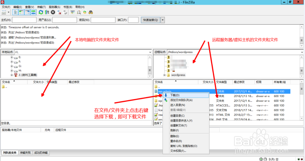 下载文件:下图为登录后的界面,在图中右侧为远程服务器/虚拟主机上的文件夹和文件,左侧为本地电脑的;在右侧的文件/文件夹上点击右键,选择“下载”按钮,即可从远程服务器下载文件到本地电脑;