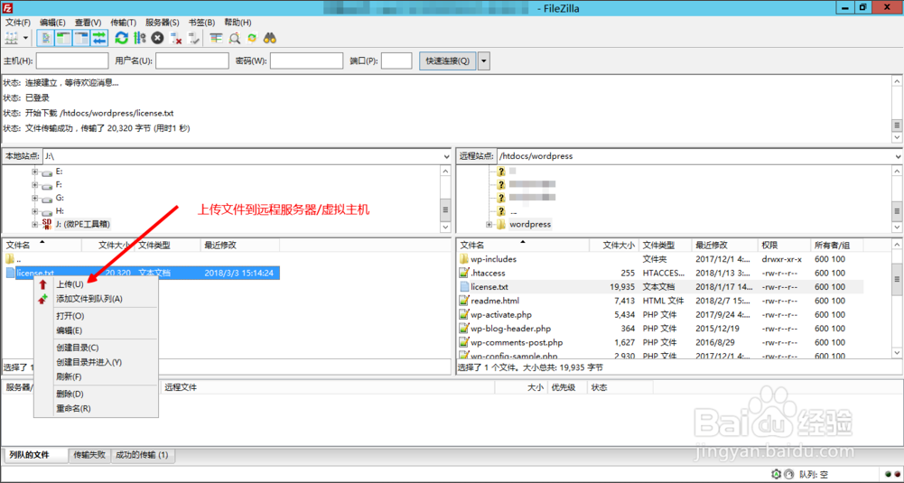 上传文件:在上图的左侧,选中文件/文件夹,然后点击右键,选择“上传”按钮,即可将本地文件上传到远程服务器/虚拟主机。