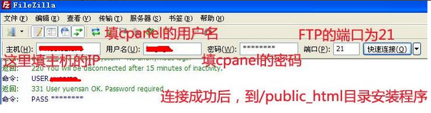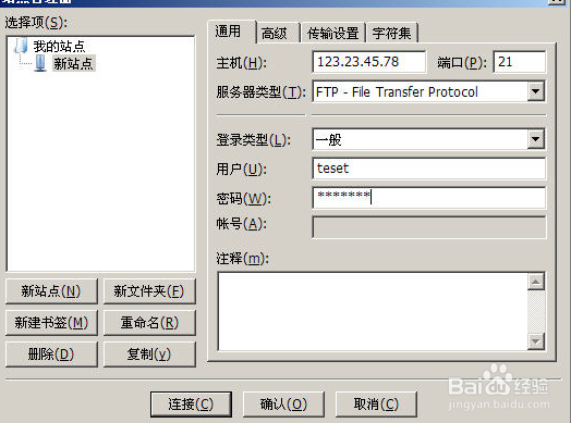第二步:按照界面所示,先输入主机(FTP服务器的IP地址),登陆类型选择“一般”,不要选择匿名选项(匿名的意思就是不需要用户名和密码可以直 接访问FTP服务器,但很多FTP服务器都禁止匿名访问),然后分别输入用户和密码。另外对于端口号我们在没有特别要求的情况下不用管它,或者输入 “21”也可以。