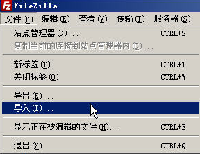 站点导入就是将之前版本的站点信息或其它FTP软件的站点信息导入进来,而不需要再进行重复的设置,这给广大的用户节省了时间,也减少了麻烦。通过菜单【站点】—>【导入】及【导出】我们就可以进行站点导入、导出操作了。