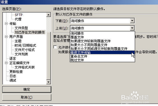 断点续传功能可以说几乎是每个FTP软件必备的功能,也可以说是最基本和重要的功能了。它的实质就是当传输文件过程中,由于各种原因使得传输过程发 生异常,产生中断,在系统恢复正常后,FTP软件能够在之前发生中断的位置继续传输文件,直到数据传送完毕为止。通过菜单【编辑】—>【设置】的对 已存在文件的操作选项我们就可以设置断点续传。