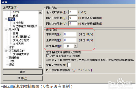 速度限制功能就是当网络比较拥挤或FTP站点有特定要求的时候,对文件的上传和下载的速度进行具体的限制。通过菜单【编辑】—>【设置】的对已存在文件的操作选项,我们就可以设置速度限制了。