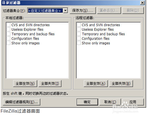 过滤器功能简单的说就是将符合条件的待传输文件及目录进行传输,我们可以通过设置扩展名、优先级类表等来控制文件的传输。通过菜单【查看】—>【文件过滤器】我们就可以对传输的文件进行选择。(但是感觉好像不起作用)