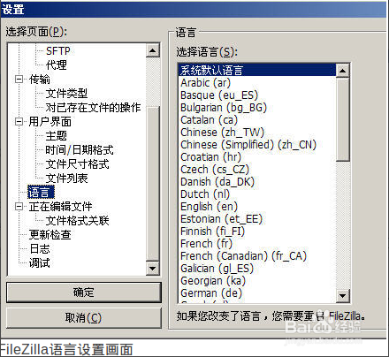 FileZilla3.0标准版支持包括中文简体在内的多语言界面。通过菜单【编辑】—>【设置】的语言选项,我们就可以设置使用的语言。