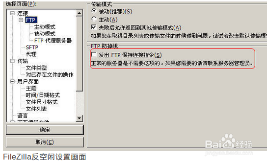 所谓防掉线或者说反空闲、闲置保护功能就是让计算机在空闲状态下每隔一段时间向FTP服务器发送一段特定信息,以便让FTP服务器知道自己还是活动的,从而并且FTP服务器断开对自己的连接。通过菜单【编辑】—>【设置】的FTP选项,我们就可以设置相关的参数